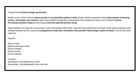 Selain itu, kami juga telah menyediakan contoh-contoh kalimat dan frasa yang dapat Anda gunakan untuk mengungkapkan minat Anda serta kualifikasi yang relevan dengan posisi yang Anda lamar. Pada akhirnya, penting untuk mengakhiri email dengan baik dan memberikan kesan yang positif. Anda dapat menggunakan kalimat penutup yang sopan seperti Terima kasih atas perhatian Anda dan waktu yang telah diberikan. Saya sangat berharap dapat mendiskusikan lebih lanjut tentang kesempatan ini. Terima kasih. Jangan lupa untuk mencantumkan informasi kontak Anda seperti nomor telepon dan alamat email agar perusahaan dapat dengan mudah menghubungi Anda jika mereka tertarik dengan profil Anda.